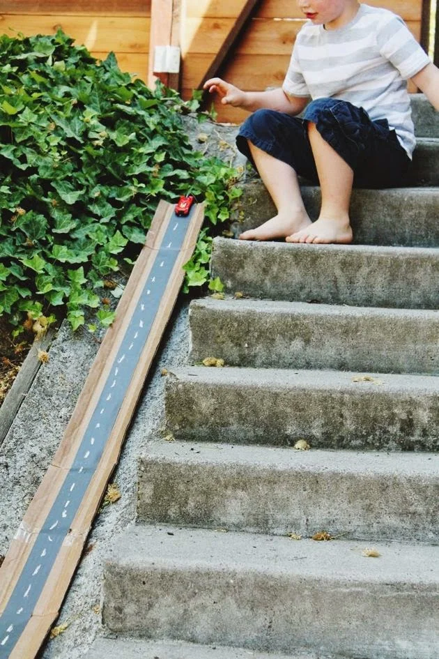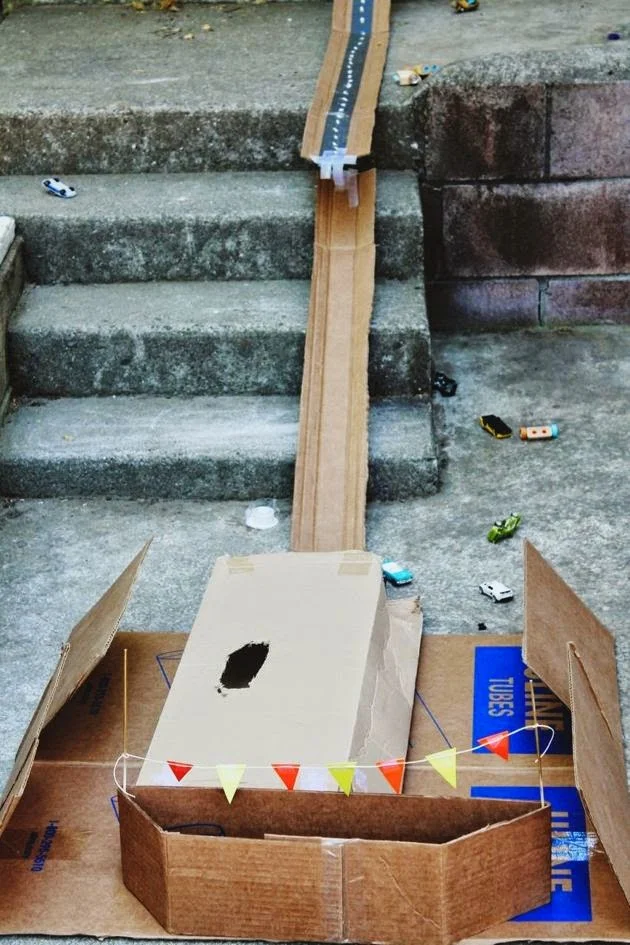 /The dog days of summer are upon us. Gone is the magic of school letting out, the first splash in the pool, and cool bite of a popsicle; we are now firmly in boredom territory. It’s time to get creative. So for today I’m giving you a real dog day project, using not much more than a little cardboard, some Scotch® Duct Tape, and a couple of old toy cars. I promise you hours of amusement and hands on fun. And wouldn’t you know it, before we started construction on the new deck, we made a little movie!