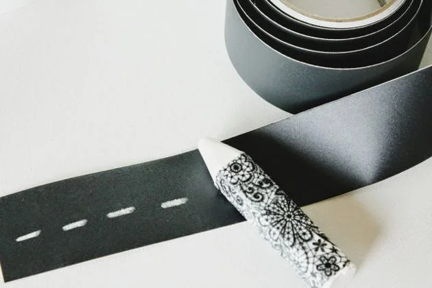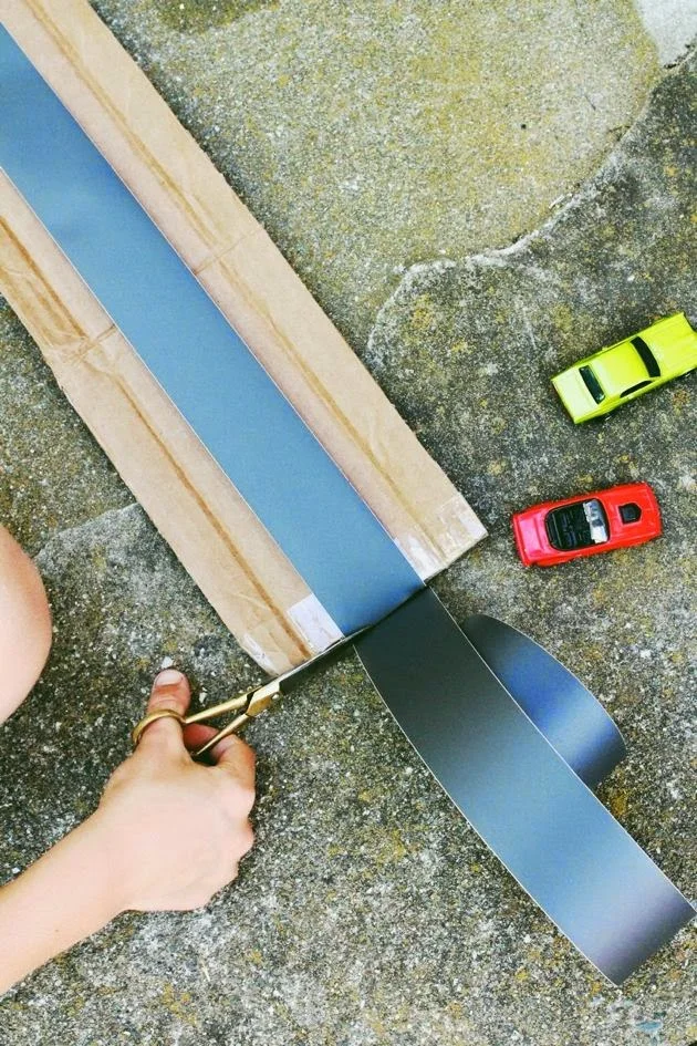 Folding the side of the track at about 1” in on either side provided enough of a lip to keep the cars on the track. To make the black track, we used Scotch® Chalkboard Tape. We secured the tape to the end of the track and one person pulled the backing from the tape while the other smoothed it along the cardboard. It was very easy.