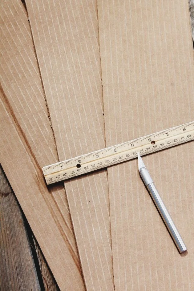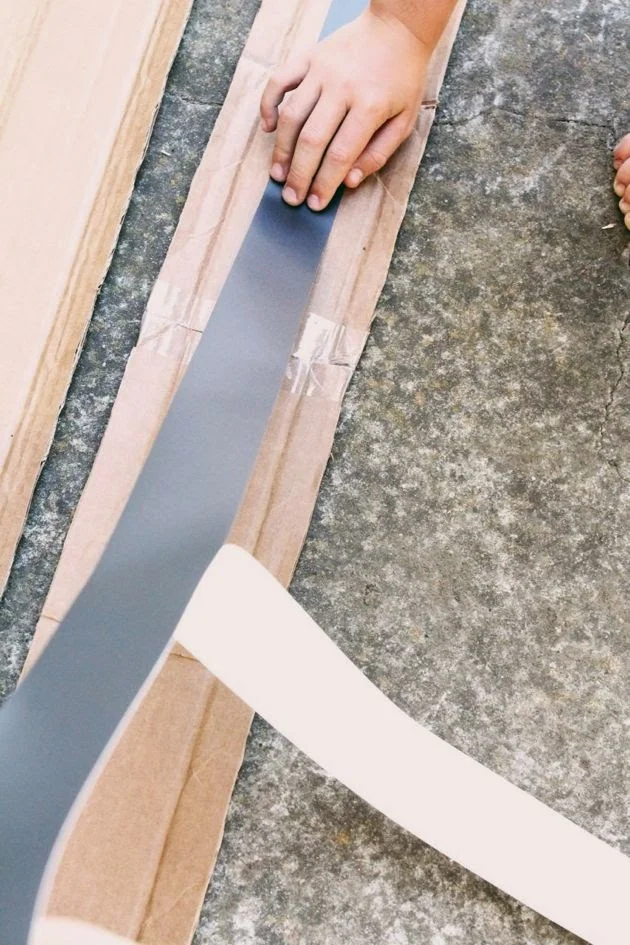 We built the race tracks by cutting 5” wide strips of cardboard and taping them together with a little packaging tape. You can do this using scissors, but it is easier and faster with a box cutter(adults only!).