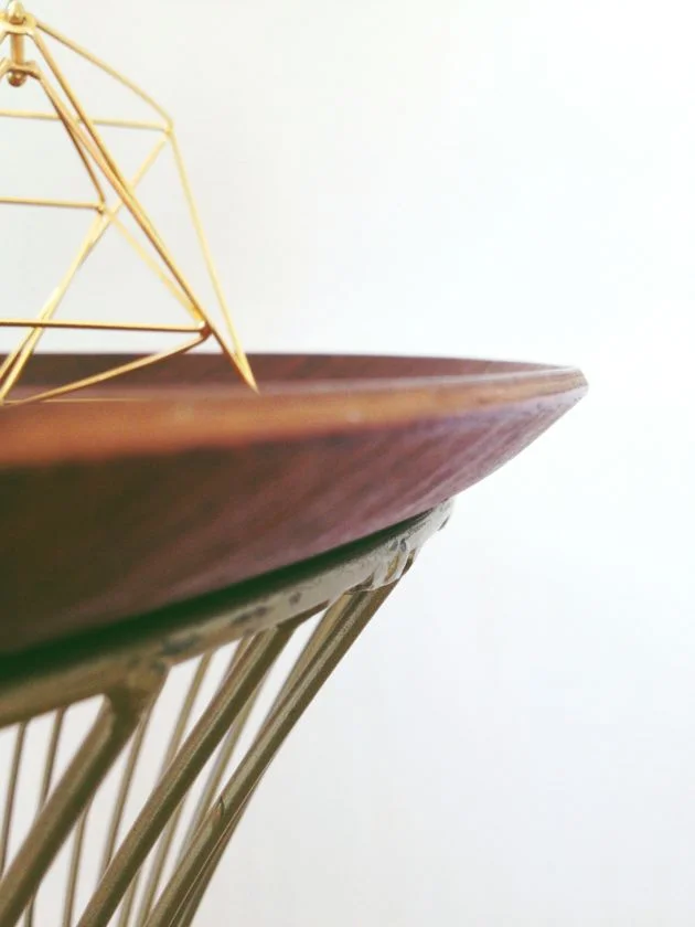 When I saw this table in the clearance section at Target I thought it was so Platner, and I had the idea to salvage the base and replace the top with something more substantial and organic than shiny black plexiglass. After a few months of searching I found a vintage walnut Danish Modern tray in the right size from Co-Mod and got started.