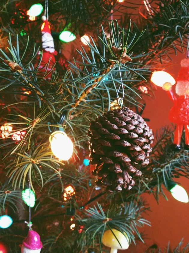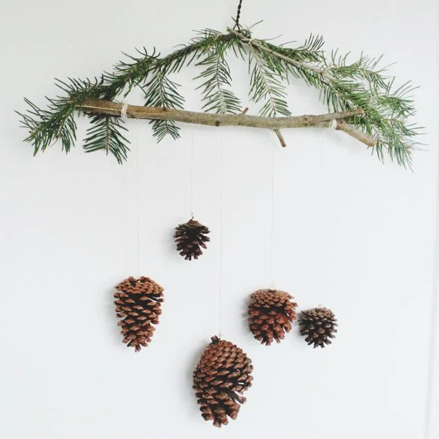 Jasper and I used some of the pine cones to make a wire coat hanger mobile by tying a stick and some tree trimmings to the frame with twine, and hanging the ornaments at different lengths. This would be a fun craft to do over the long winter break.