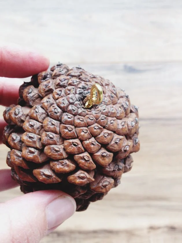 Sometimes, if we're lucky, we'll get a few pine cones on the tips of our Christmas tree which is usually a Norway pine. I love the way the cones look, textural and egg shaped. I decided to add some more to the tree this year as another repetitive ornament. This is one of those projects where instead of painting and gilding and gluing, I just kept it as is. I picked up a bag of pine cones at the grocery store for a few dollars and screwed brass eye screws to the tops, removing the stem when necessary.