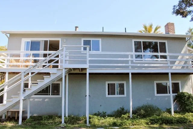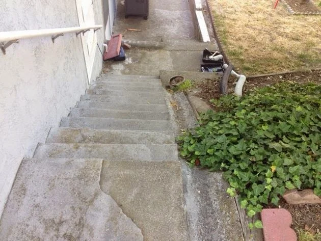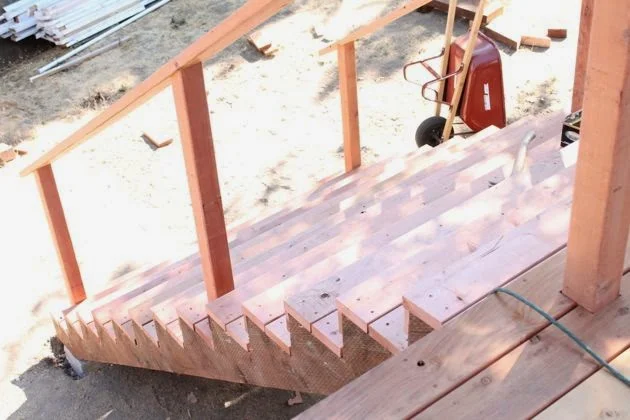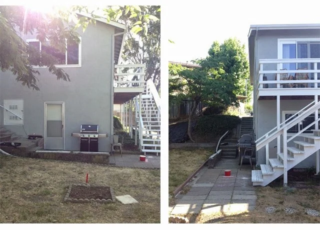 This is the before picture, taken a few days after we moved in. With a sweeping southern view of Petaluma's Cherry Valley and the Sonoma hills, the deck was barely deep enough to fit a chair without touching your feet to the railing. A narrow staircase cut across the back side of the house, blocking a lower bedroom window, and an overgrown patch of ivy was tightly knit into the ground below. That was reason enough to rethink the deck, but then there was the problem of the side yard stairs, and the drainage system that we lovingly refer to as "The Roman Aqueduct". The stairs lead from our front yard gate down into the backyard, and give access to the crawl space on the side of the house. They are slopped and the treads are very short, making them dangerous and a total eyesore.