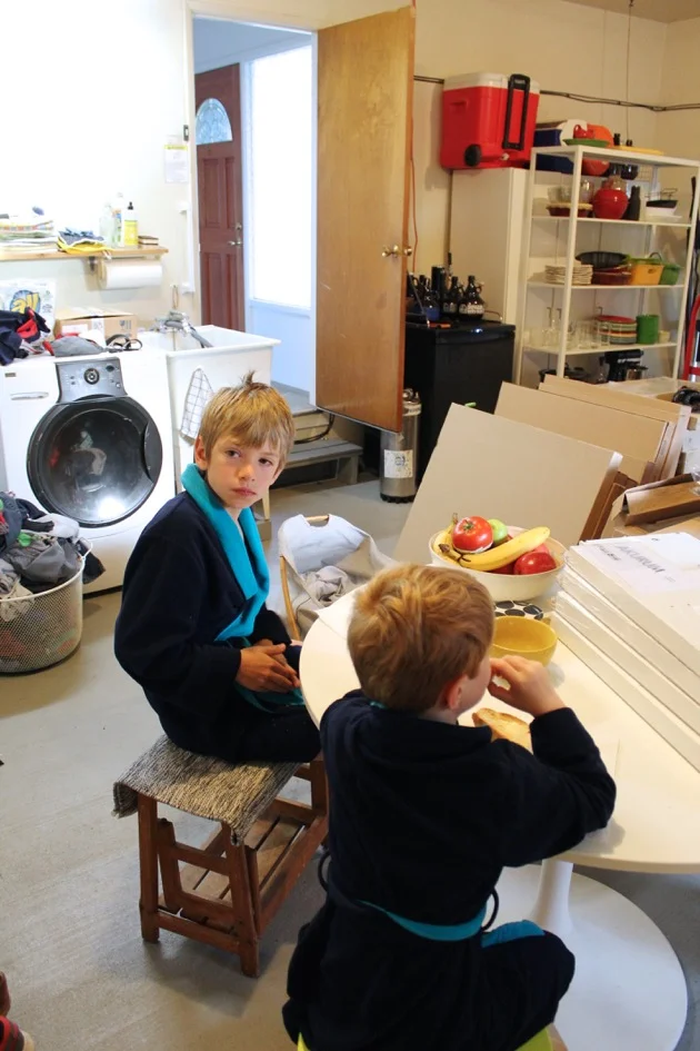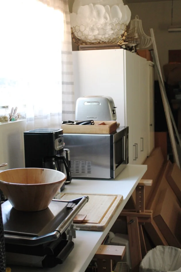 The morning routine is the trickiest. We stumble out to the garage, start the coffee, the boys squeeze around an old table and eat their cereal. We're dressed in robes and slippers, it's kind of cold, and really cramped, but it's also a little like camping which makes it fun for now, and we keep thinking about how great it will feel to move in to a more spacious home.