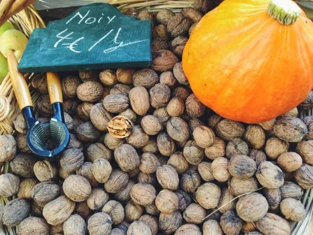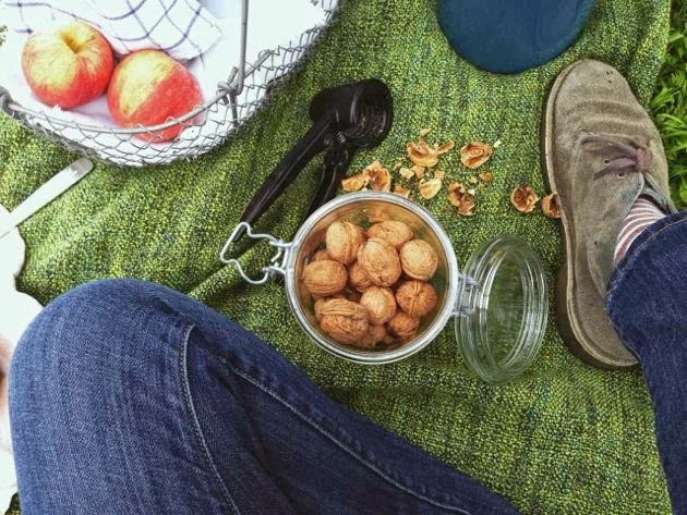 Dress warmly and pack an extra blanket. Bring along a bottle of your favorite red wine and substitute those sandwiches for some warm pumpkin soup in a thermos. My kids have been collecting walnuts from our tree so I included a jar of fresh walnuts and a couple of apples. So simple, but so tasty. Just the way the French like their food.